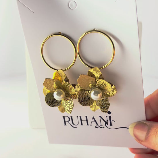 Elegant gold-plated floral hoop earrings with a pearl center, radiating timeless beauty and graceful charm.