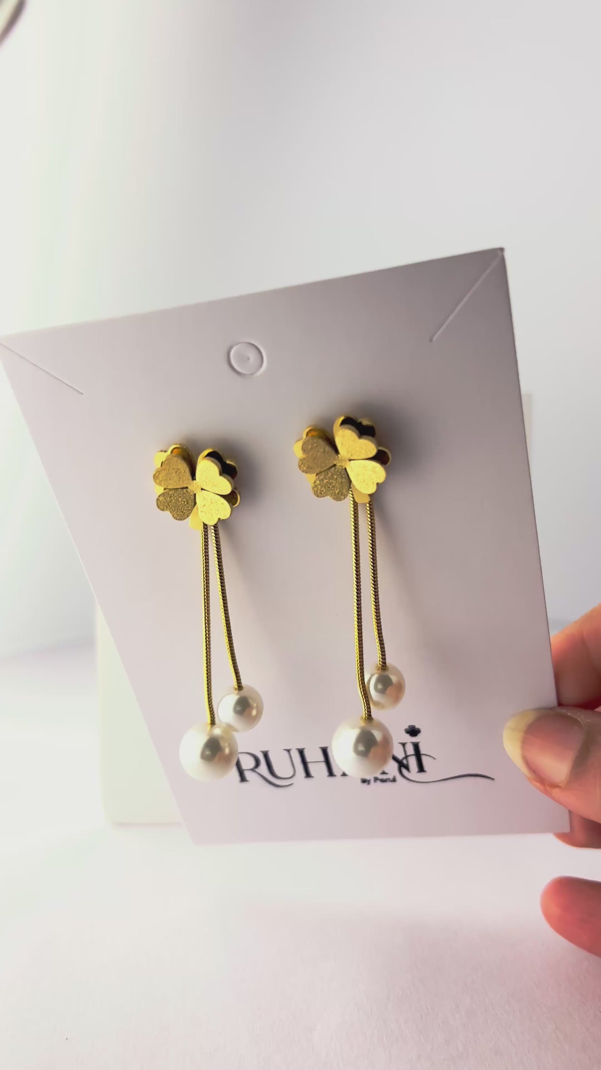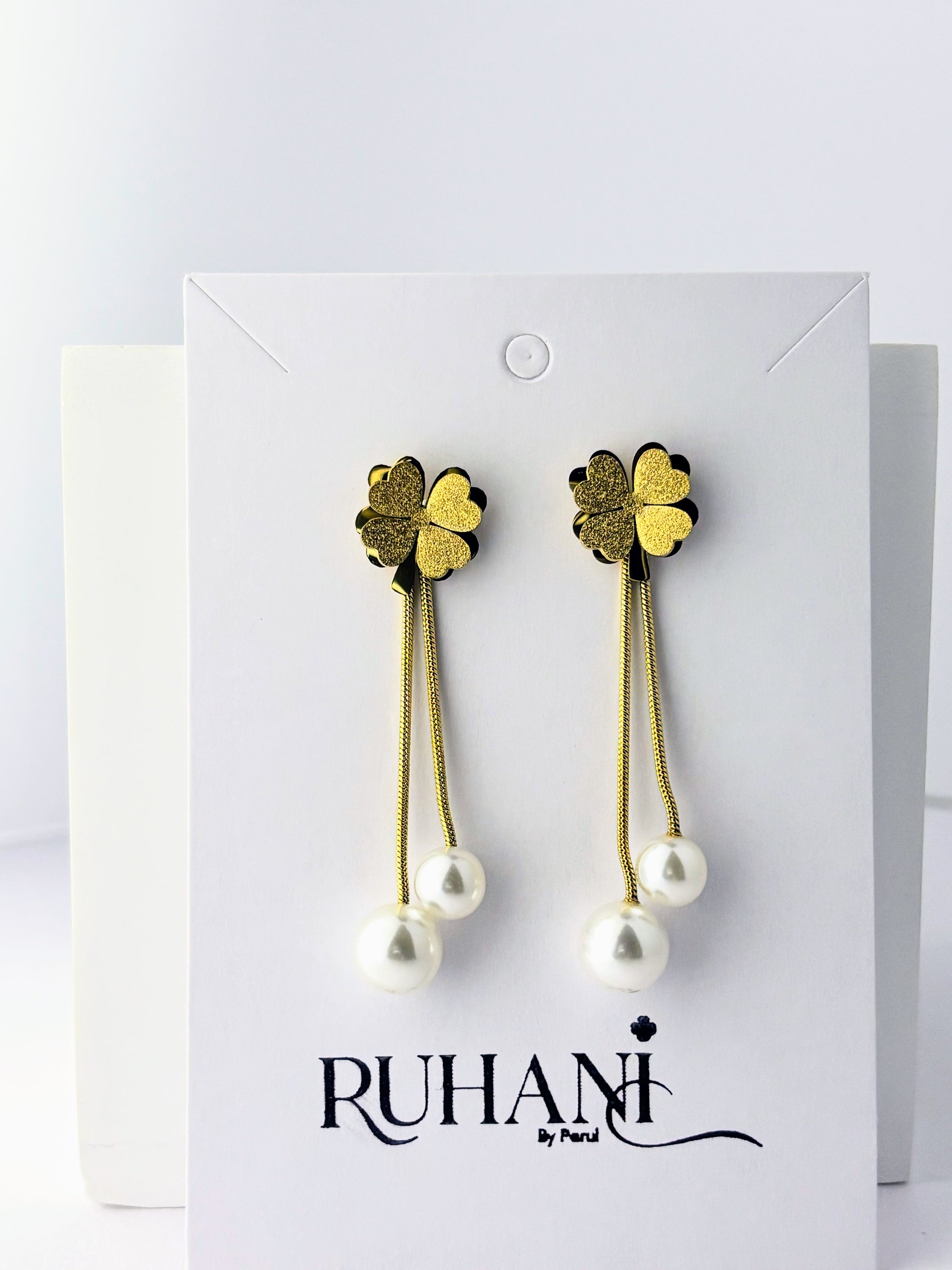 Gold-plated clover stud earrings with twin pearl drops, symbolizing luck and elegance in every detail.