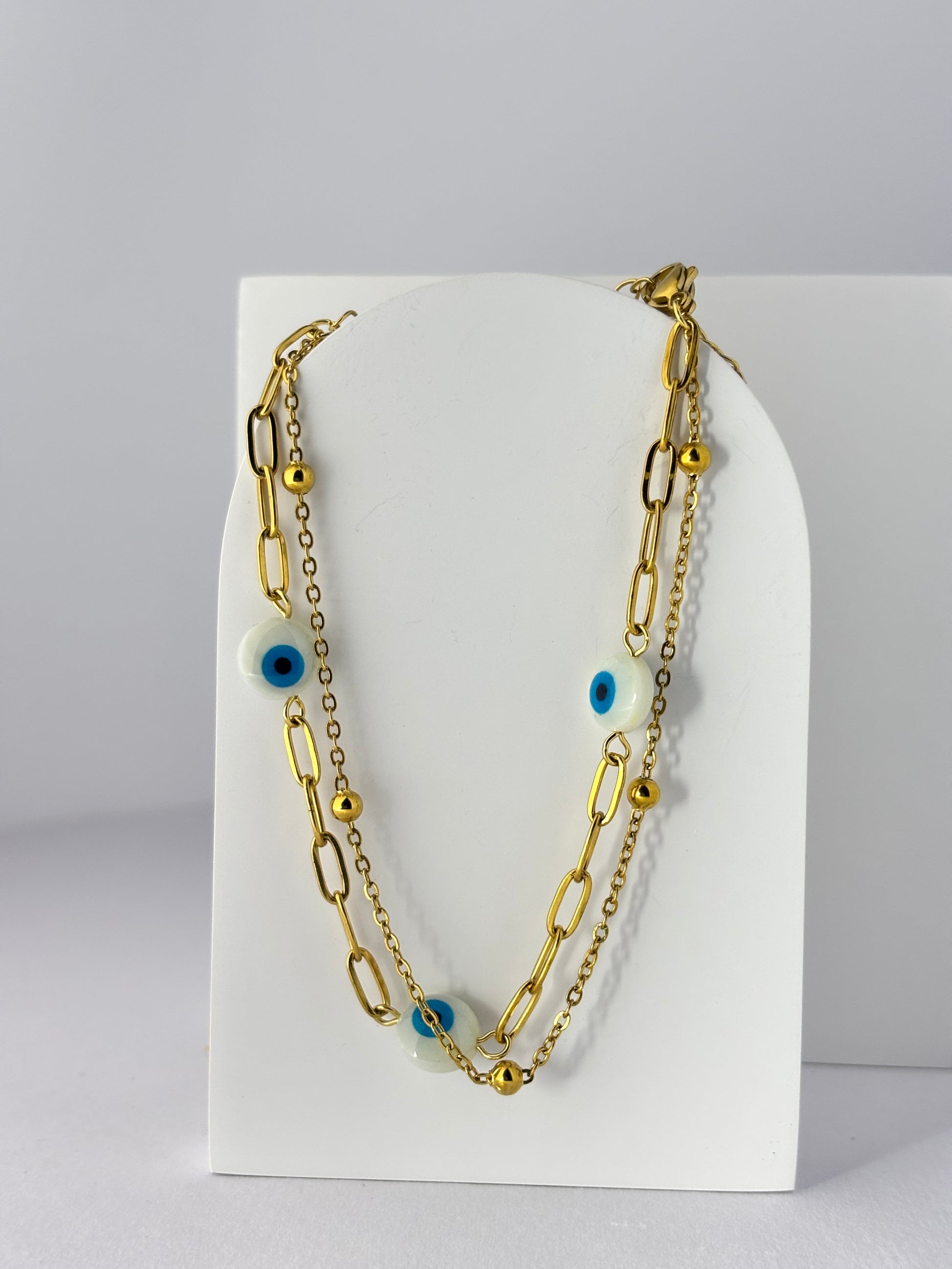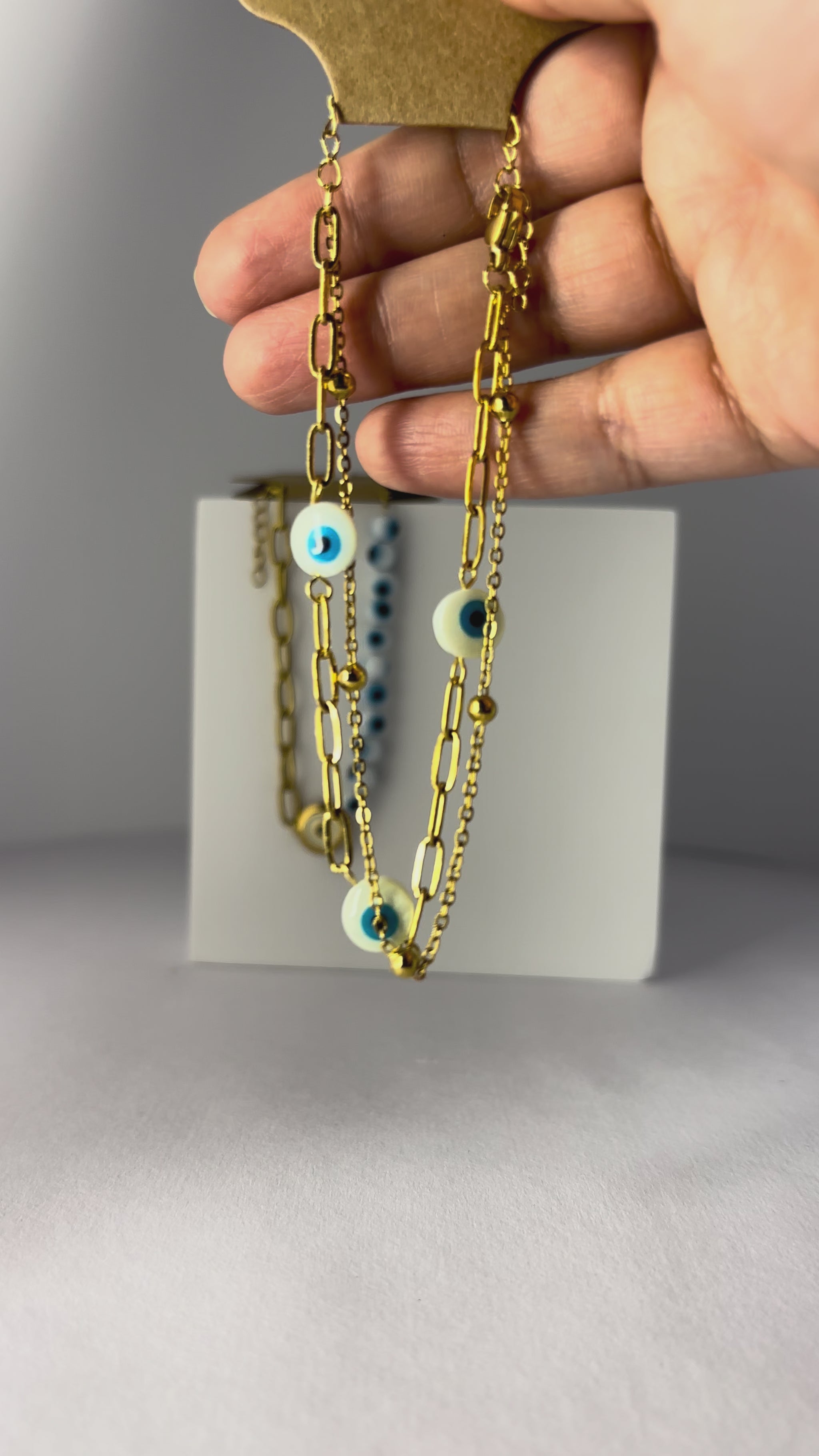 A yellow gold-plated bracelet with bold links and striking evil eye beads, crafted for style, protection, and modern elegance.