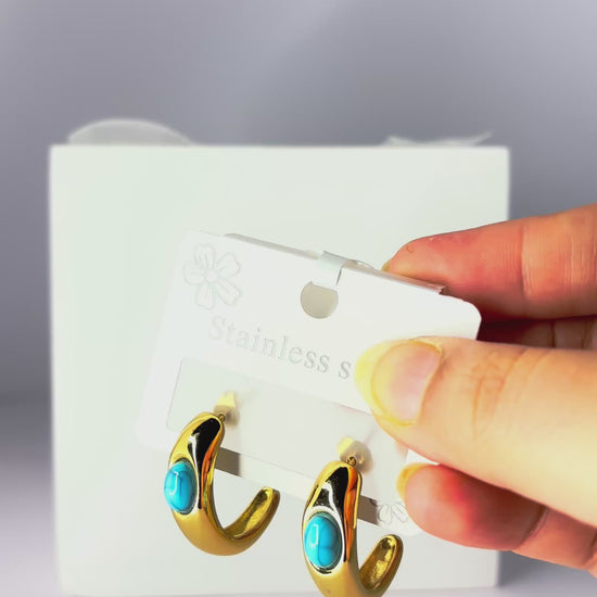 Gold-plated mini hoops adorned with vibrant turquoise stones, blending modern style with timeless elegance.