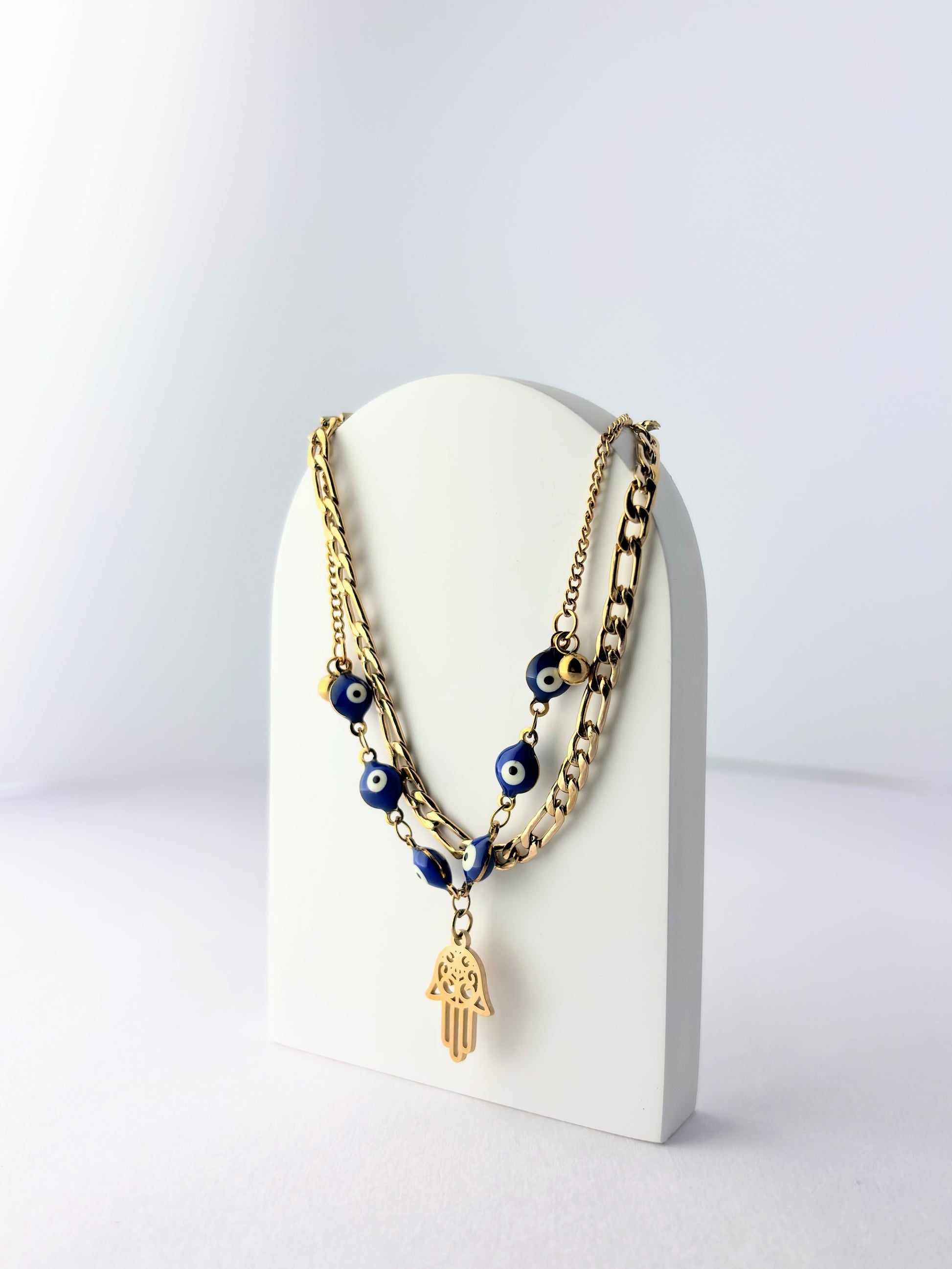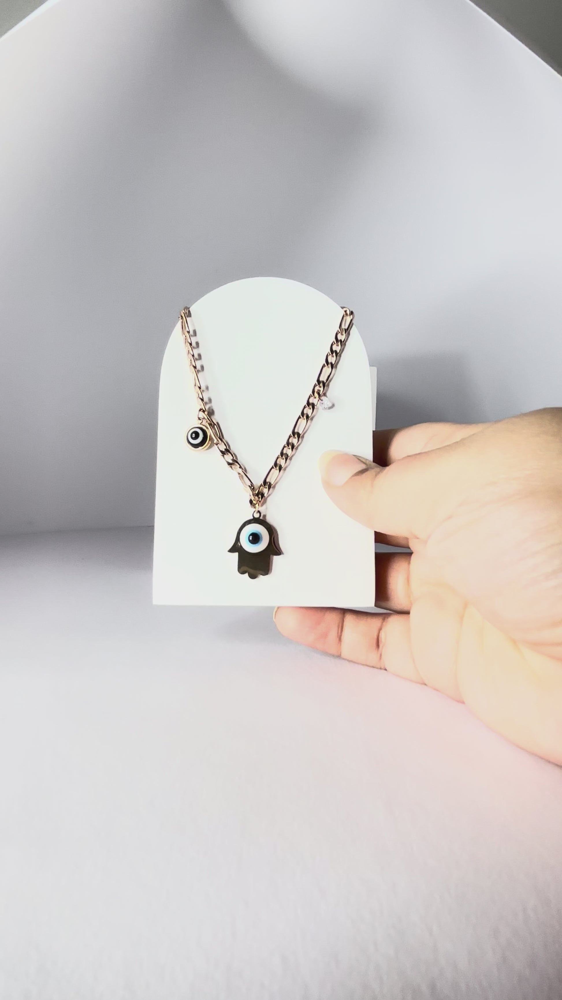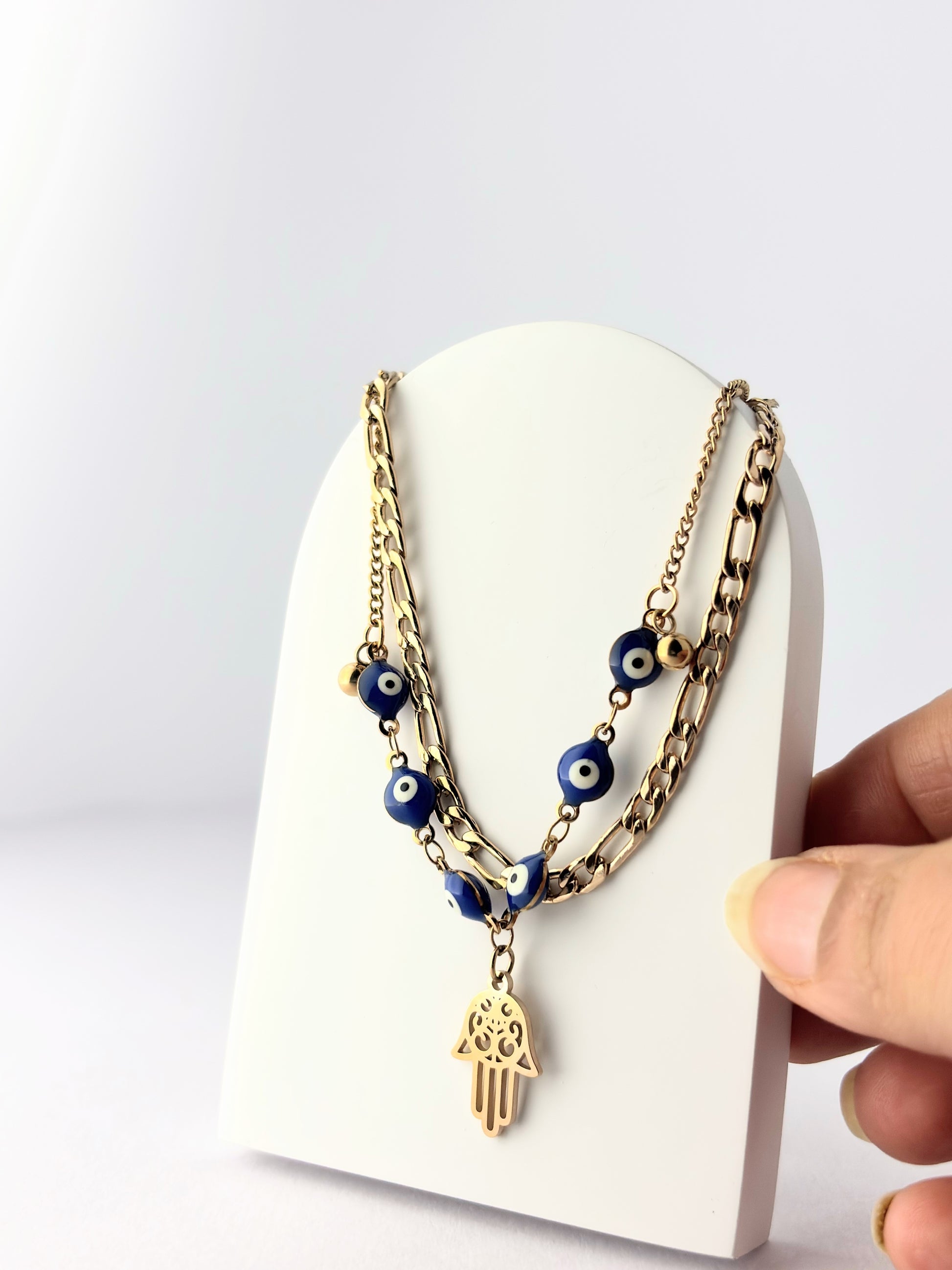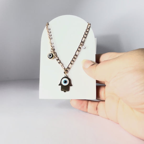 A rose gold-plated bracelet featuring the Hamsa hand and evil eye charm, symbolizing protection, strength, and graceful elegance.