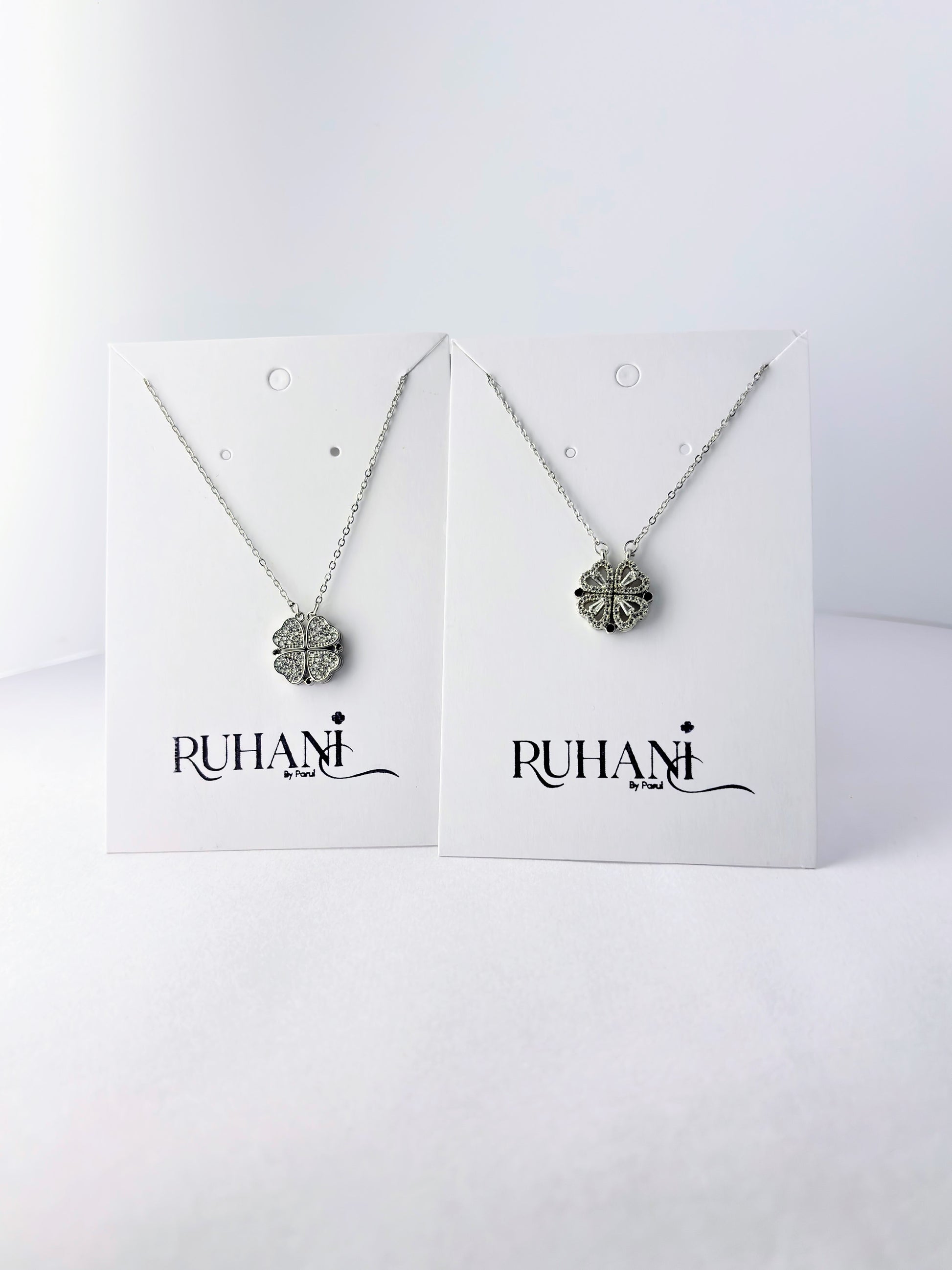 A sleek silver necklace with magnetic heart pendants in prong setting, symbolizing unbreakable bonds and everlasting love.