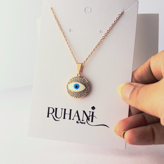 A chic rose gold–plated necklace featuring the protective evil eye, blending elegance with positivity and charm.