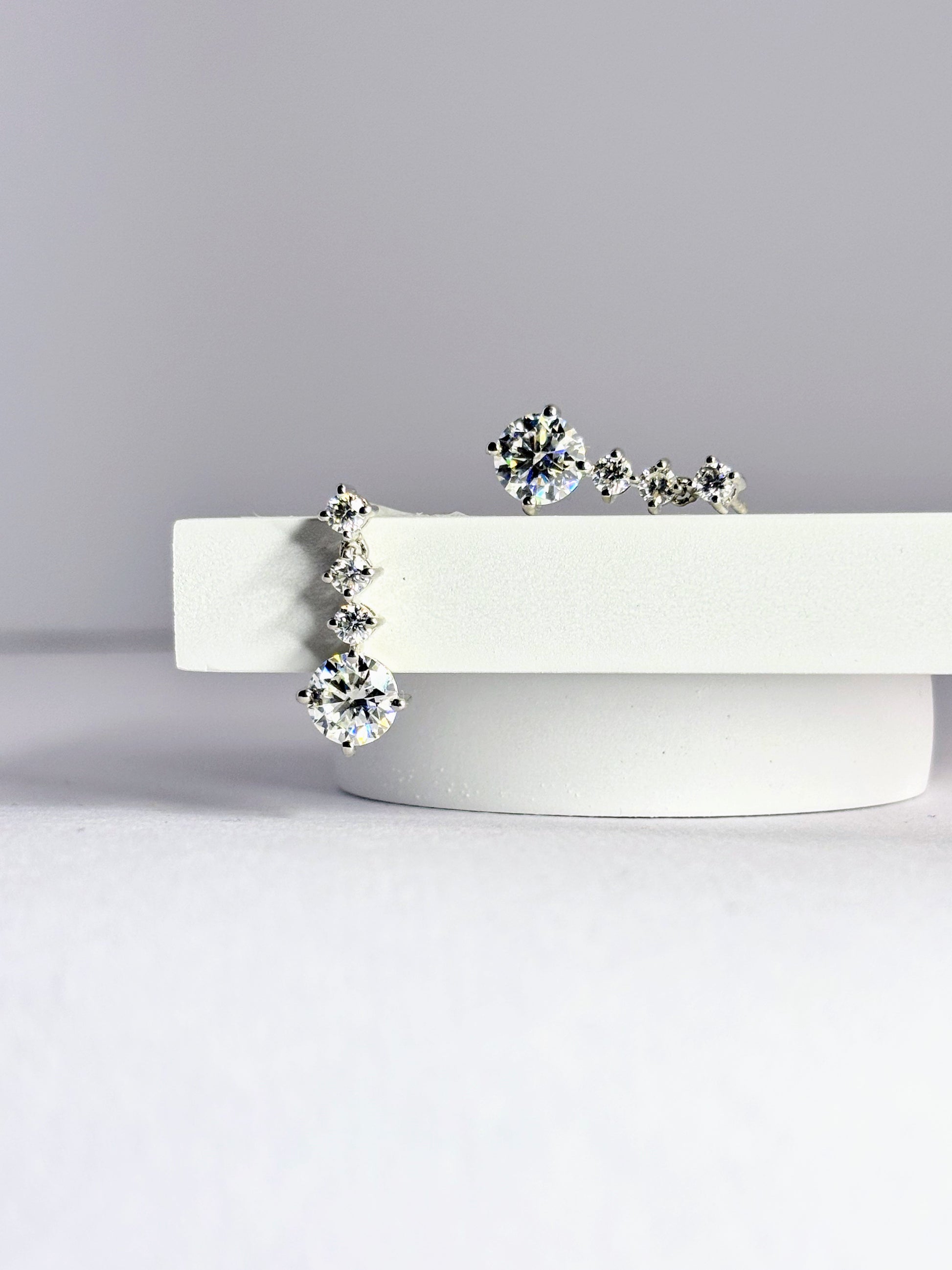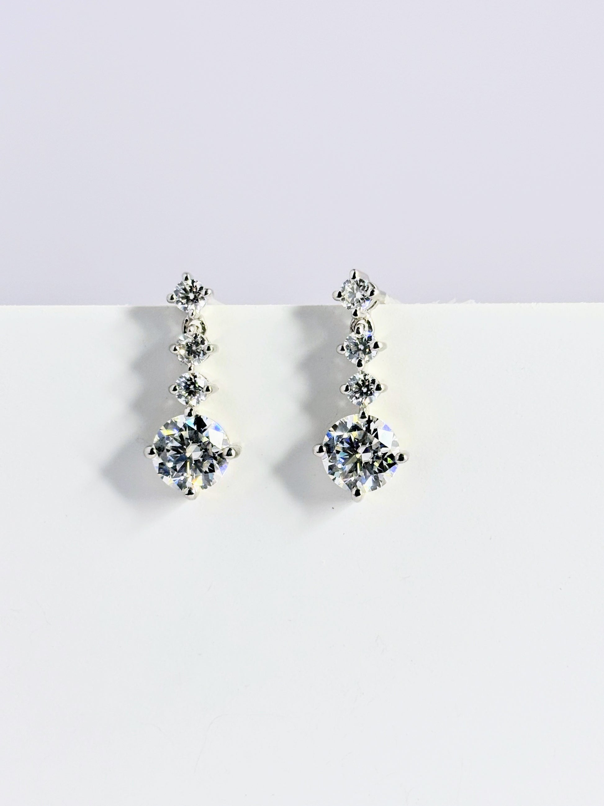 A dazzling pair of silver-toned earrings featuring cascading moissanite stones, finished with a brilliant solitaire drop for timeless elegance.